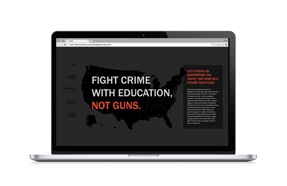 This project extends my infographics mapping "100 black victims of police homicide in 2014" as I unfold a step by step process seeing relevant variables around America's current epidemic. Although efforts like Black Lives Matter exist, I believe my site informs viewers both positive and negative situtations around these environments and finally proposes a solution to go back to supporting the youth in order to create a better solution.